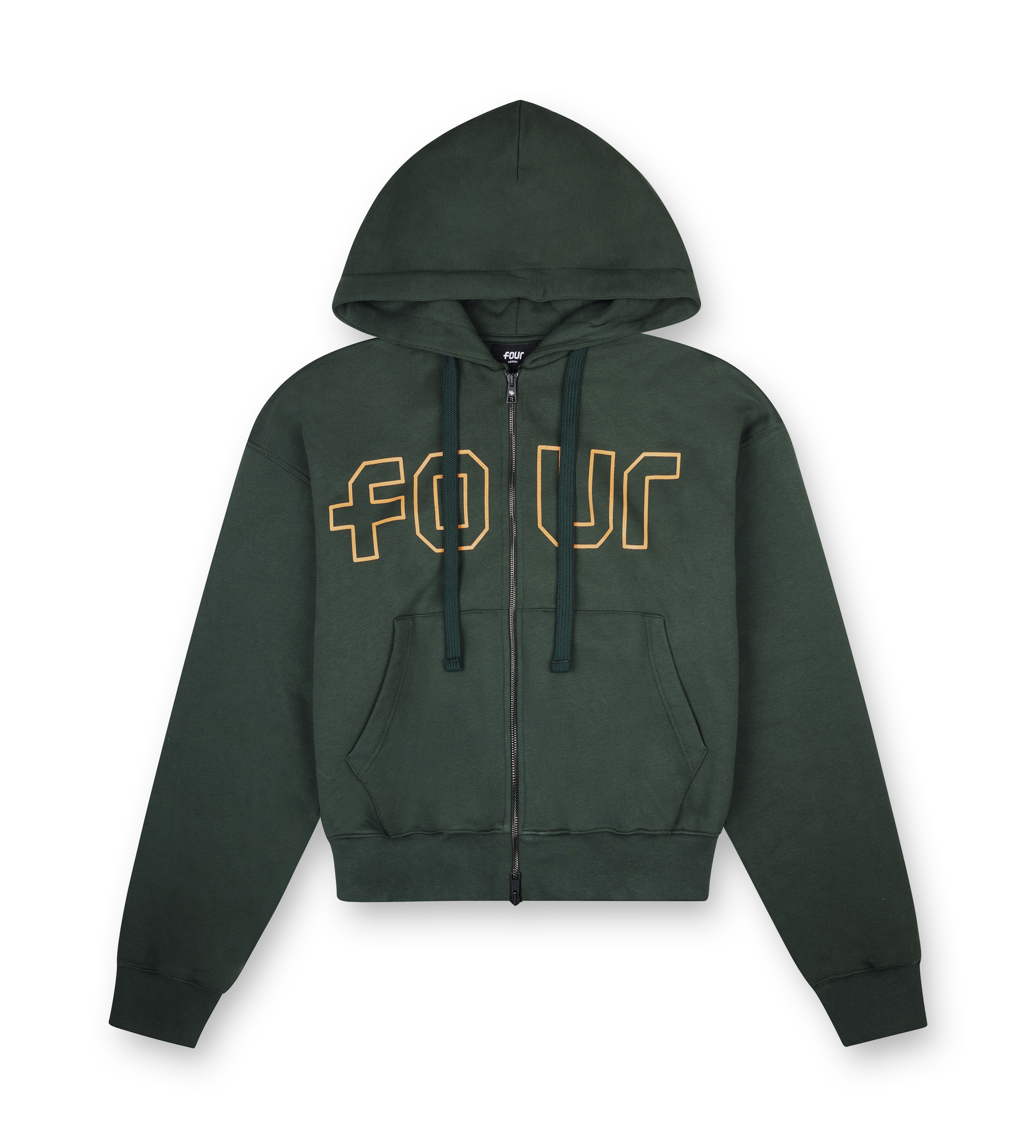 The FOUR Outline Boxy Zip-Up Hoodie in Deep Forest with detailing in Dusty Orange blends comfort and structure in a bold, minimalist style. Made from 330gsm heavyweight cotton fleece, this hoodie features a boxy silhouette, branded metal zipper, and Outline Logo embroidery on chest.